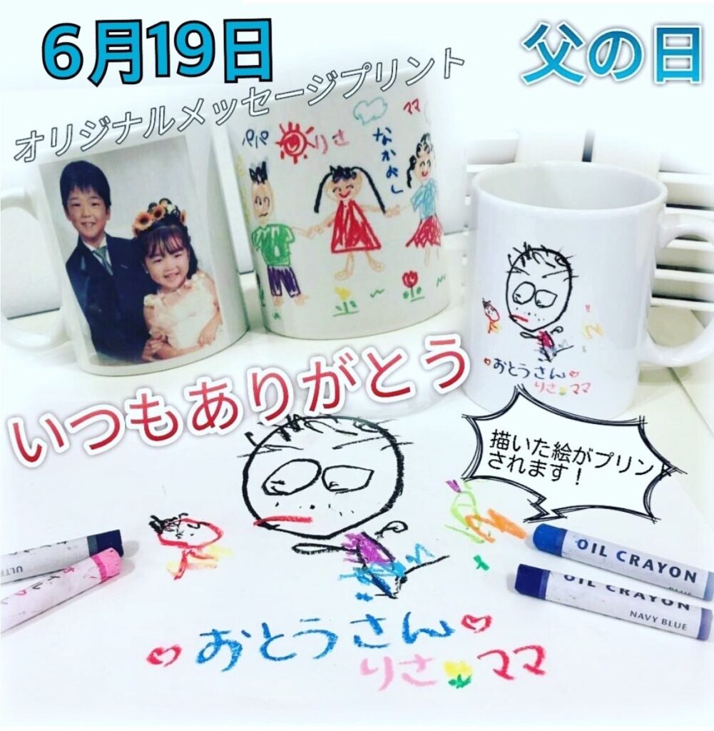 お仕事頑張ってるお父さんに、僕や私からメッセージを書いてマグカップにプリント。もちろん写真入りも喜ばれます。