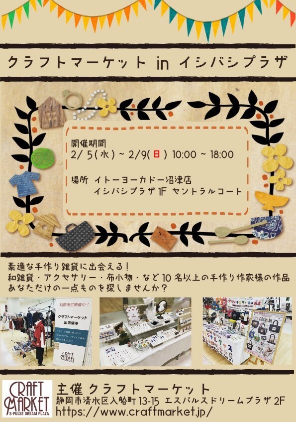 2月5日水曜日から9日日曜日まで、イトーヨーカドー沼津店イシバシプラザ1階にて、クラフトマーケット主催のイベント出店です。クラフトマーケットから、10組以上のハンドメイド雑貨が出店します。 オリジナルグッズも出店します。是非、イシバシプラザにお... -
