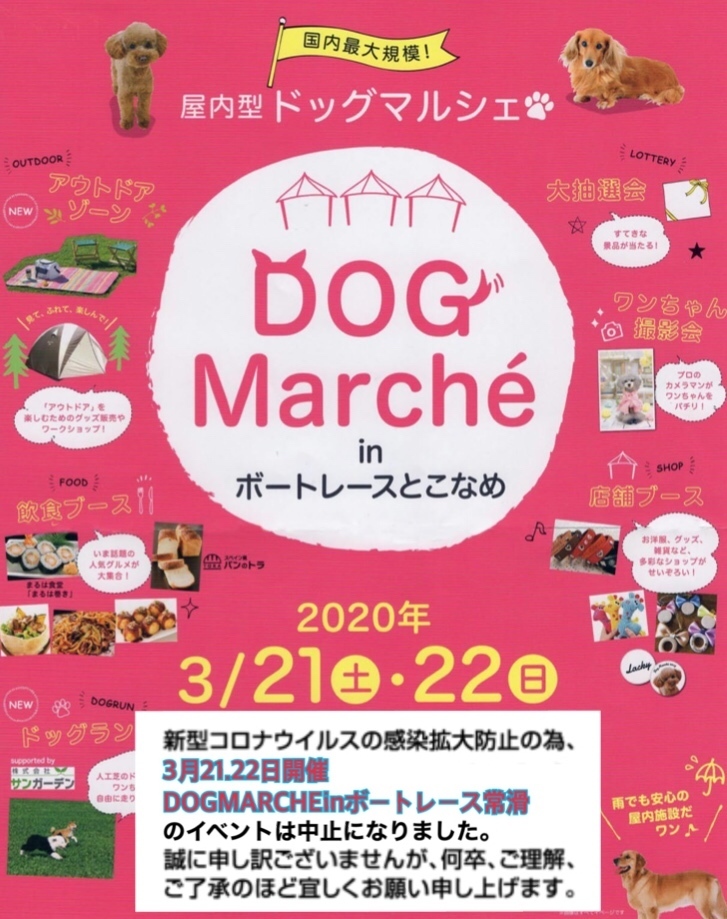 「DOGマルシェinボートレースとこなめ」(2020.3.21-22)中止のお知らせ 2020.3.21-22に開催を予定しておりました、DOGマルシェinボートレース常滑は、新型コロナウイルスの感染者が増加している中、数千人規模の多数が集まる屋内イベントであることも考慮... -
