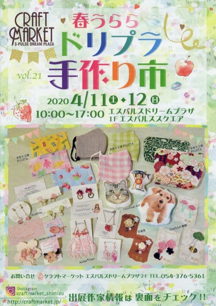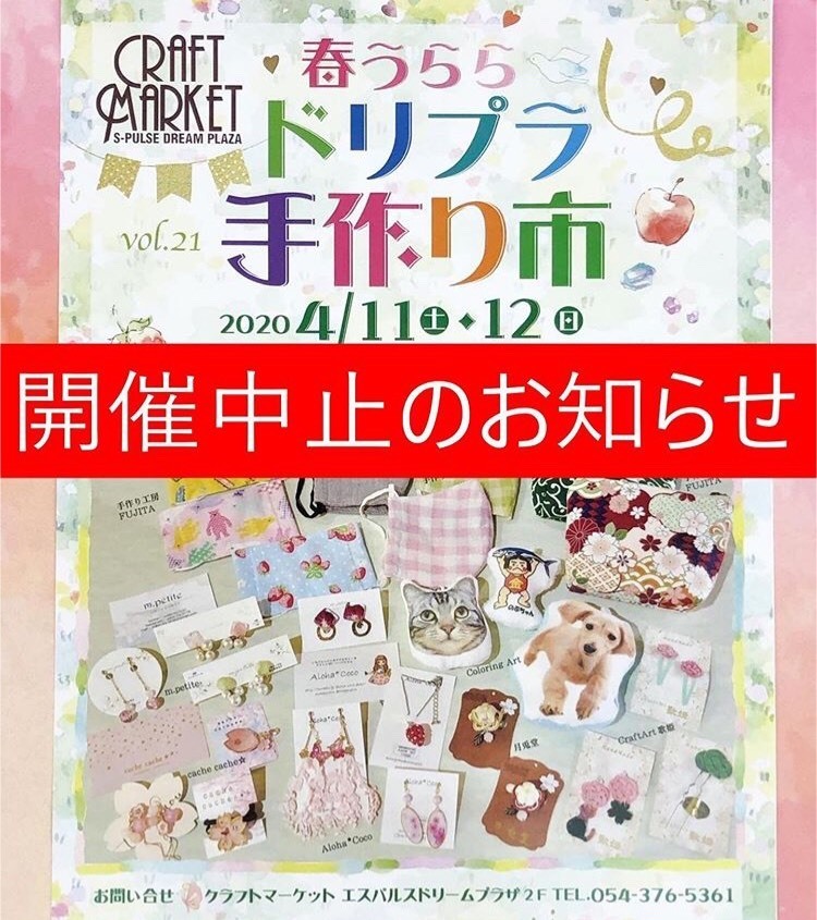 4月11日12日に、エスパルスドリームプラザにて開催される手作り市は新型コロナウィルスの感染が拡大している現状を考え、開催中止となりました。楽しみにして下さいました皆様には、申し訳ない気持ちでいっぱいです。早く収束して、元の日常が戻ります様に... -