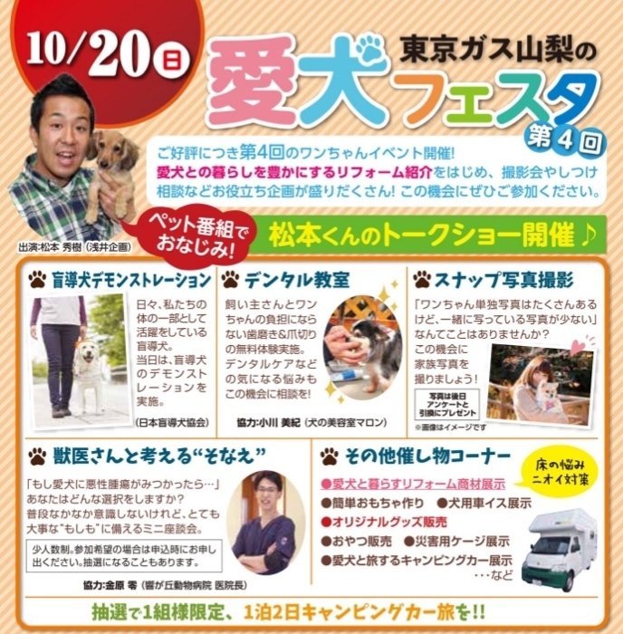 10月20日はテレビ山梨敷地内にて山梨県甲府市の東京ガス山梨さん主催、愛犬フェスタに出店します。ペット番組おなじみの松本くんのトークショーもあります!清水では、松本くん好きだから会いに行きたい~~っとのお声をたくさんいただきました! 9月19日... -
