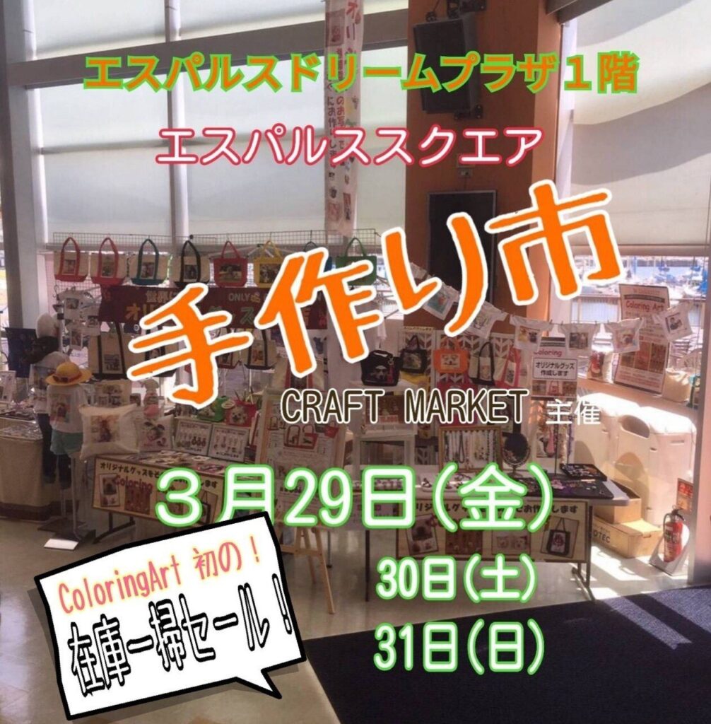 3月29日(金)30(土)31(日)エスパルスドリームプラザ1階エスパルススクエアにて、手作り市開催します!ColoringArt初の在庫一掃セール(セール)します‼️ 発売当初のサンプルや、ちょい汚れ等。。。格安で販売➰✨ もちろん、お好きなお写真プリントします。... -