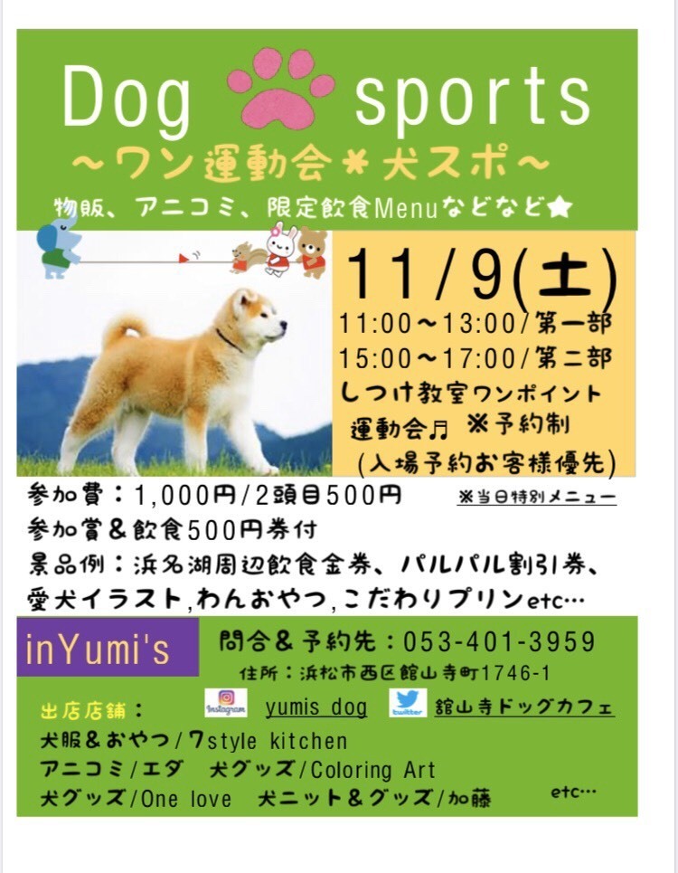オリジナルグッズカラーリングアート11月イベント情報です。 11月9日は、ユミーズ舘山寺さんにて、Dogスポーツ。ワンちゃんの運動会の開催です。こちらは予約制になりますので、お電話にてお問い合わせお申し込み下さいませ。 0534013959ユミーズ舘山寺 1...